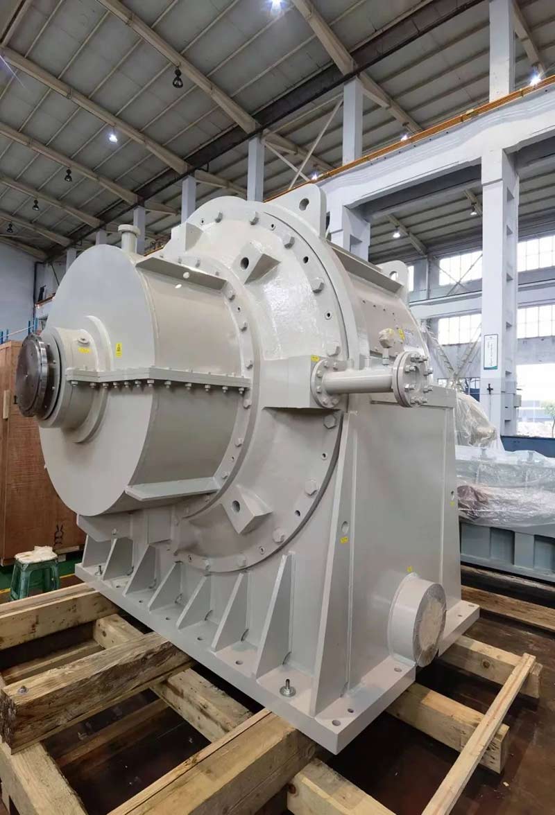 This project is the development of a high-power and high-speed ratio NW type high-speed planetary gearbox for a scientific research unit. The gearbox’s rated power is 8000 kW, rated input speed is 4000 r/min, reduction ratio is 20, and the gear linear speed is 45 m/s. This gearbox is the first NW type planetary gearbox developed independently by our company, it has solved key technologies such as gear design for NW type planetary mechanisms, equal load mechanism design, planetary wheel sliding bearing design, thin-walled nitriding internal gear ring manufacturing, and dual-planet wheel processing and manufacturing. This lays foundation for the development of high-power and high-speed ratio high-speed planetary gearboxes for our company.